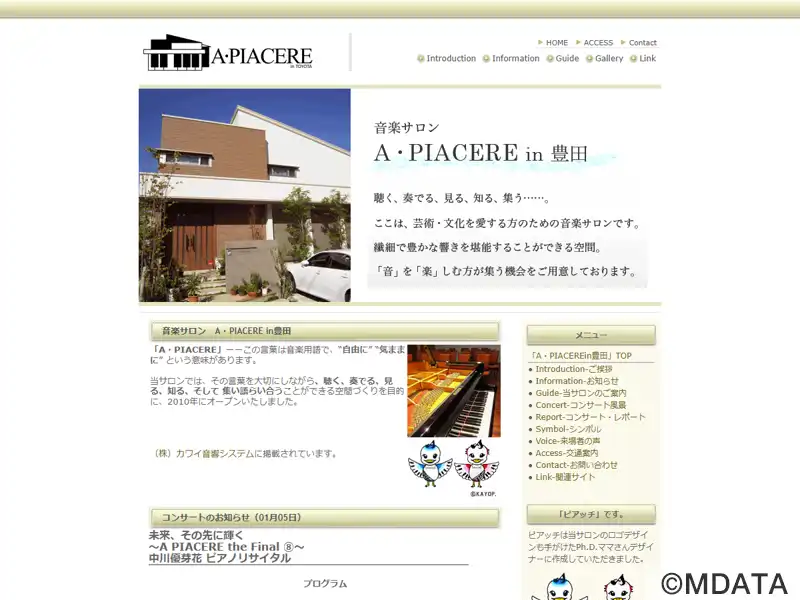 2010年に豊田市浄水町の住宅地にオープンした、音楽を愛する人が集うサロンホール。ホール名の「A・PIACERE」とは音楽用語で、「自由に、気ままに」という意味があり、その言葉を大切にした空間づくりを目指している。天井高5mの木調のホールは、上部の採光窓と間接照明により豊潤な響きが天上の光とともに降り注ぐような印象を与える。ピアノはスタインウェイD274で、ピアノリサイタル、コンサートが開催される。