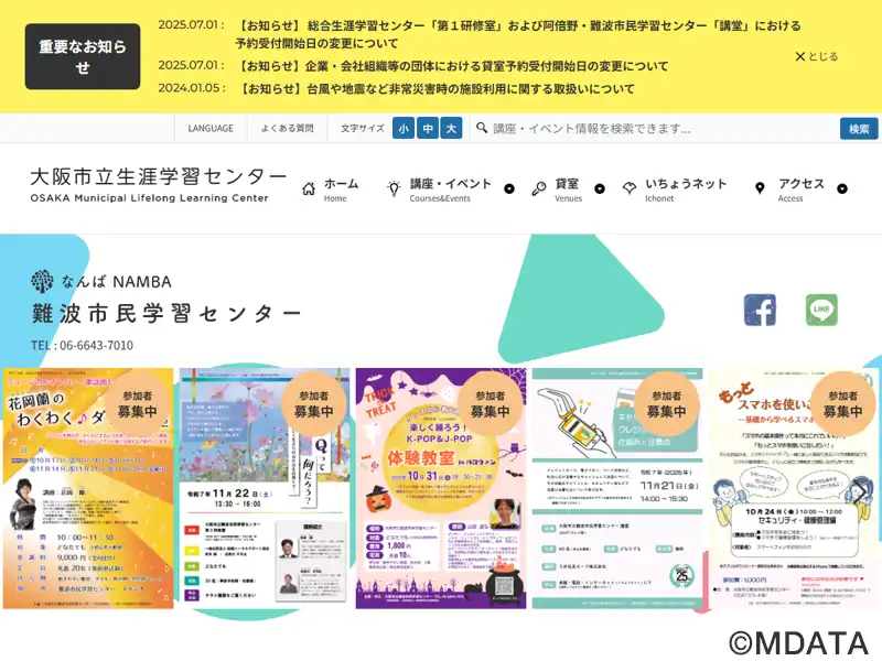 JR難波駅直結OCAT4階にある、市民学習や文化活動を支援する大阪市の公共施設。講堂、会議室、研修室、スタジオ、和室などが用意され、芸術文化・学習・交流の場となっている。貸しホールの「講堂」は定員120名、グランドピアノ完備で、アンサンブルコンサート、落語寄席、上映会、講演会などのイベントが開催されている。また、スタジオは定員30人で一面鏡張り、ディアパソンのアップライトピアノも完備する。