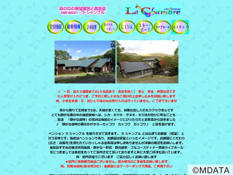 長野県茅野市に位置するペンション「ラ・シャンブル」に併設されたライブホール。白樺湖畔の静かな森に囲まれた立地で、四季折々の自然を背景にした音楽空間を提供する。約50畳のホールにはグランドピアノ、ドラムセット、ギター・ベースアンプなどの設備を備え、ビッグバンドによる演奏も可能。音楽合宿やコンサート、会議利用にも対応し、展望貸切風呂や家庭用サウナ等とあわせて、滞在型の文化活動に適した環境が整っている。