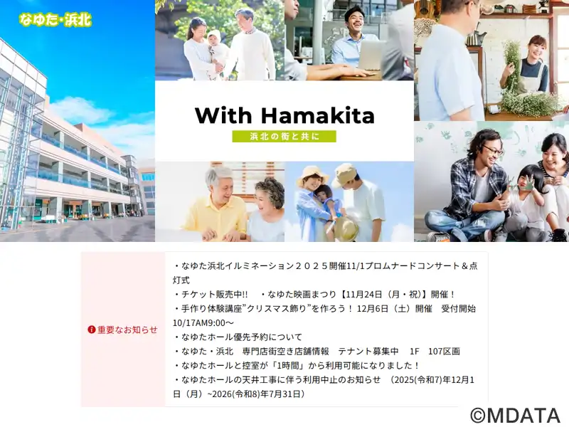 浜北駅から徒歩1分。3Fなゆたホールは可動式の座席406席の多目的ホール。演劇やコンサート、音楽やダンスなどの発表会、可動席を収納すれば平土間として利用でき、パーティー、展示会など幅広い用途に対応。フロア使用時のみ飲食可。3つの練習室、市民ギャラリー、会議室、にぎわいプラザ、公益施設(浜北図書館、浜北区役所)と1F/2Fに商業施設が入った複合施設。バリアフリー対応。