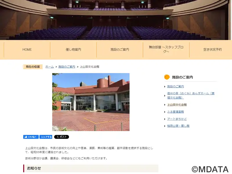 千曲川のほとり、万葉橋を渡ってすぐのレンガ造りの建物が「上山田文化会館」。温泉地として有名な戸倉上山田の文化活動の拠点として1980年に開館。952席のホールはプロセニアム形式の舞台をもつ多目的型ホールで、母子観覧室を完備。成人式など式典の会場、また貸館運営を中心にコンサートやお笑いライブ、特設舞台でのざぶとん寄席など自主事業を実施。グランドピアノを設置したホワイエでの気軽なコンサートも開催。