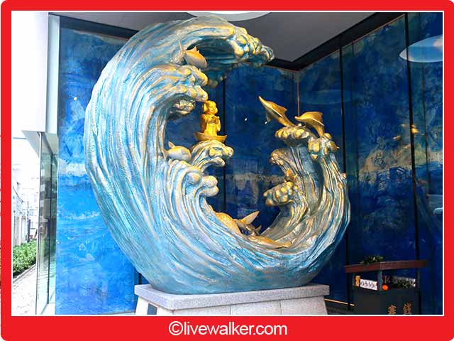 フランス・コルシカ島に住む「光の画家」松井守男の作品(中央下)。エントランスやホワイエ、館内の要となる場所に作品が飾られ、光の動線を形成している。えびす様尊像から「青」でつながる空間。色彩と筆致、気のうねりに乗って、潮流の彼方へ…。