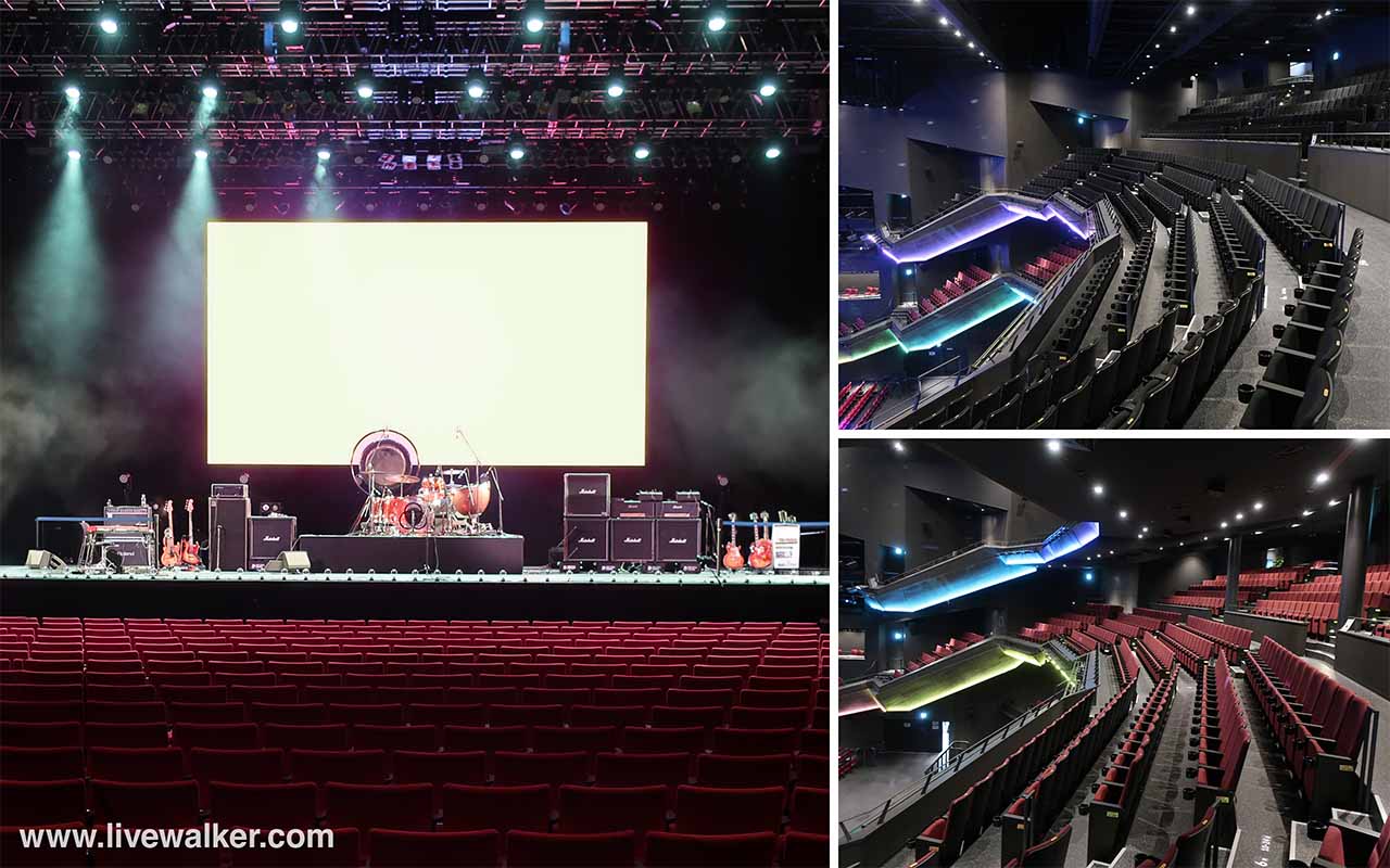 音楽ライブを主目的に設計されたホールは、アリーナと3層のスタンド席で構成されている。中央の座席は千鳥配置で、傾斜により視界を確保。どの席からもステージが見やすく、没入感のあるライブ体験を提供する。最上階からはステージ演出や会場全体の熱気を見渡すことができる。