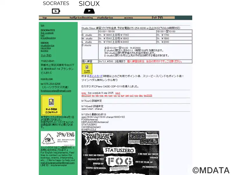 京都出町柳に位置する音楽施設。ライブスペース「SOCRATES」は、キャパシティ30~50の小箱ライブハウスで、音質重視のサウンドシステムや機材を揃える。気持ちのいい爆音をカスタムメイドで提供。音楽スタジオ「SIOUX」はスタジオ全4室が利用でき、個人練習から30人程度のバンドリハーサルも可能。大型アンプはJC-120、マーシャル、メサブギ、ヒュース&ケトナー等、様々なギターサウンドに対応する。