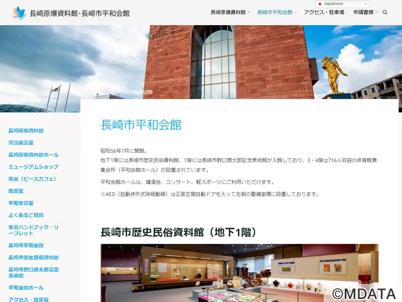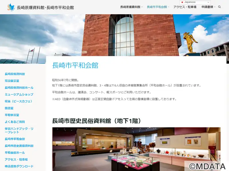 1981年7月開館。長崎市平和会館3・4階に位置する「平和会館ホール」は716人収容の多目的ホール(1F移動席650席+固定席66席)。平和を発信する多様な文化活動の場として、高性能な音響システムを導入し、講演会や平和学習イベントを主体に軽スポーツ練習、各種イベントが行われる。地下1F「長崎市歴史民俗資料館」1F「長崎市野口彌太郎記念美術館」併設。