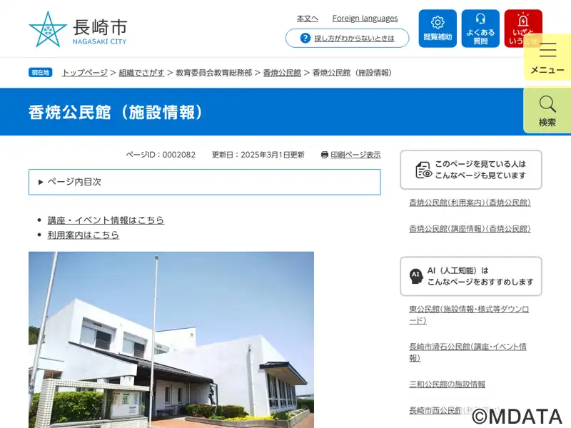 1983年3月に竣工した屋根のフォルムが特徴的な香焼町公民館。診療所や小中学校に隣接した市民の健康・文化ゾーンエリアに立地する。木を多用したインテリアで優れた音響効果の文化ホールは、グランドピアノ(ヤマハC7)、音響照明設備、16ミリ映写機を完備し、コンサートや発表会が行われる。会議室、和室、調理実習室は海の眺めが良く、第一会議室は平床の多目的スペースで講座や映画会、地域のイベントに活用されている。