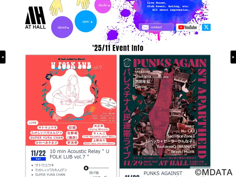 大分市の若草公園近くに2004 年にオープンした 多目的イベントスペース。音楽ライブ、クラブイベント、映画上映、トークライブなど多彩な用途に対応している。最大140名収容可能で、充実した音響・照明設備を備え、プロジェクターやステージング機材の貸し出しも行い、さまざまなイベントの開催をサポートする。練習スタジオ「アトスタジオ」を併設し、ライブリハーサル、バンド・個人練習、レッスン室として利用できる。