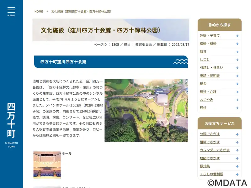 四万十緑林公園の小高い丘に、1995年4月に開館した文化施設。メインのホールは、扇型に配置された客席と丸みのあるステージ形状が美しく、コンサートや演劇、発表会、講演会など幅広いジャンルで、心が通いあう温かなイベントが開催可能。ガラス張りのホワイエからは、緑林公園の緑が清々しく望める。60人収容の会議室(多目的室)もあり、窪川の町づくりの中核となるシンボル施設として、地域の文化活動に貢献している。