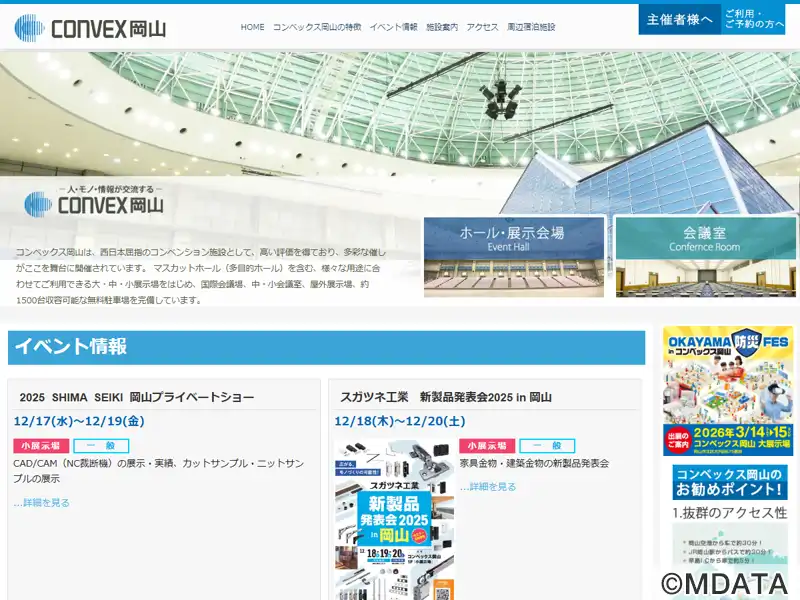 岡山県における情報・文化・技術の向上と、産業の振興を目的に1991年に開業した総合展示場。岡山の文化やビジネスの発展を支える重要な拠点となっている。マスカットホールの名をもつ中展示場は大曲面ドームをもつ無柱スペースに充実した音響を備え、ライブコンサートからスポーツなどが開催されている。その他多数の、展示場や国際会議場を備える。屋外展示場も備え、西日本を代表するコンベンション施設の一つとされている。