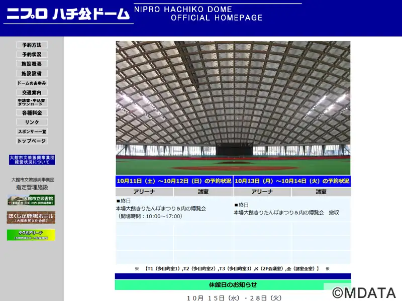 地元秋田杉を用いた長径178m、収容人員15,000人(5,040席の観客席)をもつ世界最大級の木造ドーム。透光率の高い膜屋根で内部が明るく、吸音性や音響効果にも優れる。野球(両翼90m中堅120m)を主体にテニス(10面)やフットサル(6面)などスポーツイベント、展示会、コンサート、大規模イベントの主会場として利用。2017年4月よりネーミングライツ現愛称。県有施設として1997年8月オープン。正式名、大館樹海ドーム。