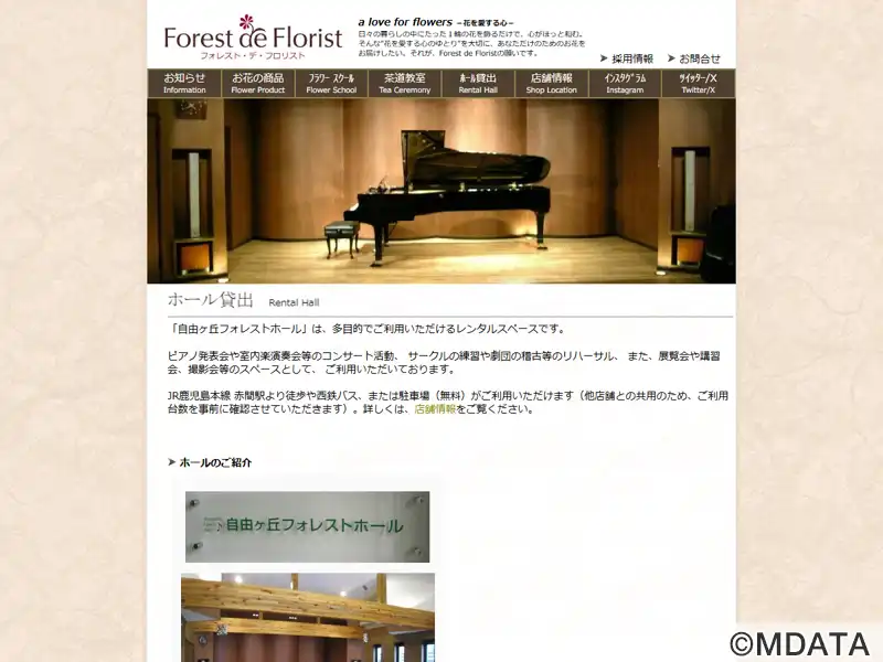 宗像市にある、フルコンサートグランドピアノ常設のレンタルホール。天井が高く、木の温もりを感じられる広くて開放的な空間で、ピアノ発表会や室内楽演奏会などのコンサートに最適なホール。また、サークルの練習や劇団の稽古等のリハーサル、セミナー、展覧会、、撮影会等のスペースなど幅広い用途にも対応できる。可動式の客席を50席まで設置可能。生花やプリザーブドフラワーを扱うお店「フォレスト・デ・フロリスト」を併設する。