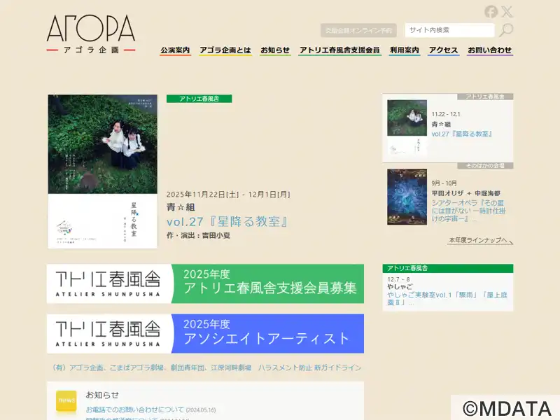 1984年開館した小劇場。芸術監督の平田オリザとプログラム・オフィサーによって構成された、春夏のシーズン(4〜9月)、秋冬のシーズン(10〜3月)の公演プログラムが開催されている。「劇場を通じての若手劇団を支援する」システムを掲げ、通常の劇場ホールレンタル業務ではなく、全ての公演を「こまばアゴラ劇場プロデュース」とすることを目標としている。私塾、無隣館を設立して、演劇人の育成も積極的に行なっている。