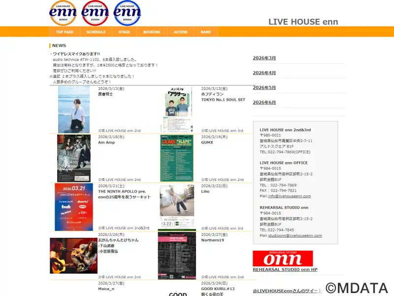 仙台市青葉区にある、特色の違う2タイプのライブハウス。同一の建物、仙台ストックマンビル内にあり、独自のイメージカラーで専用のドリンクカウンターも備えている。「enn 2nd」はロック、ポップス、メタルなどを主体とし、一方「enn 3rd」はジャズやアコースティックを重視する。どちらのホールも音響設備が充実。アマチュアからプロまで、さまざまなジャンルのアーティストが出演。仙台駅に近く、駐車場もあり。