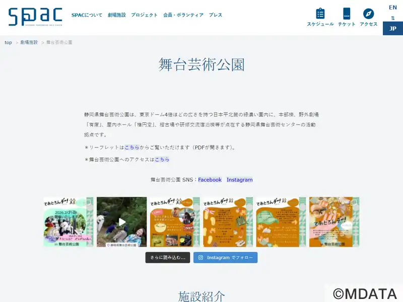 静岡・日本平北麓の緑豊かな場所に位置する、東京ドーム4個分の広大な芸術公園。自然との共生を象徴する野外劇場「有度」、漆黒の舞台と白木の柱が一体となった屋内ホール「楕円堂」、舞台と客席を自由に組み替えられる「BOXシアター」の3つの劇場を備える。その他、ミニミュージアム「てあとろん」や、ミーティングルーム、資料室を備えた本部棟、国内外の舞台芸術関係者が利用できる研修交流宿泊棟などの施設を備えている。