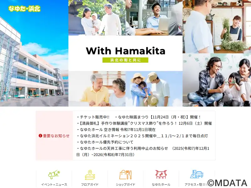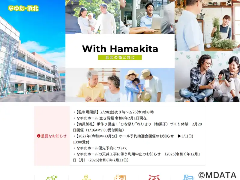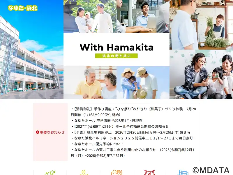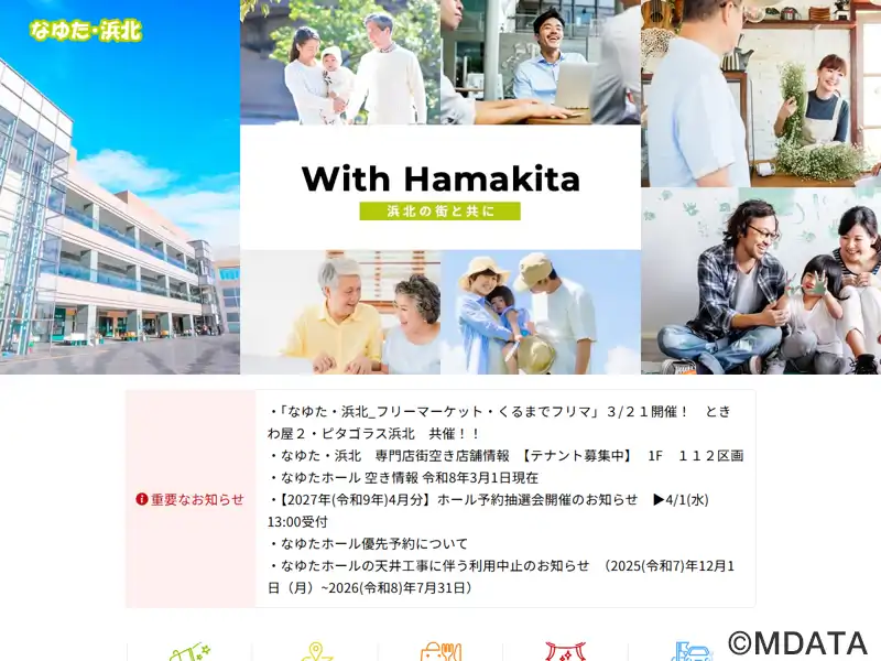 浜北駅から徒歩1分。3Fなゆたホールは可動式の座席406席の多目的ホール。演劇やコンサート、音楽やダンスなどの発表会、可動席を収納すれば平土間として利用でき、パーティー、展示会など幅広い用途に対応。フロア使用時のみ飲食可。3つの練習室、市民ギャラリー、会議室、にぎわいプラザ、公益施設(浜北図書館、浜北区役所)と1F/2Fに商業施設が入った複合施設。バリアフリー対応。