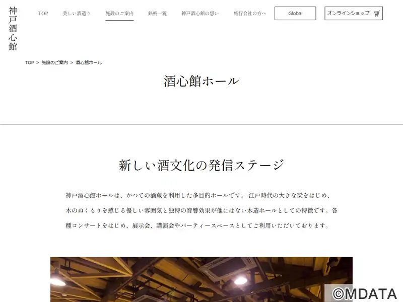 神戸市東灘区の神戸酒心館にある多目的ホール「豊明蔵」。建物は、かつて、創業1751年の清酒「福寿」の酒蔵として使われていたものを修復したものであり、古い大きな梁や木材に包まれる優しい雰囲気が特徴。音響照明設備やグランドピアノも完備されており、コンサートや発表会など、様々なイベントに利用可能。新しい酒文化の発信ステージとして位置づけられており、酒心館の歴史や文化に触れながらイベントを楽しむことができる。