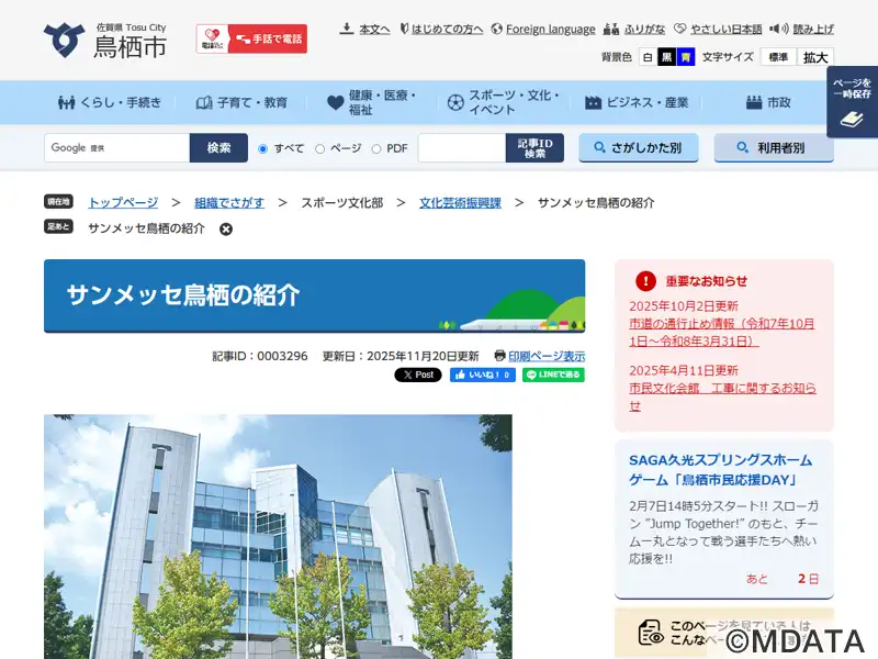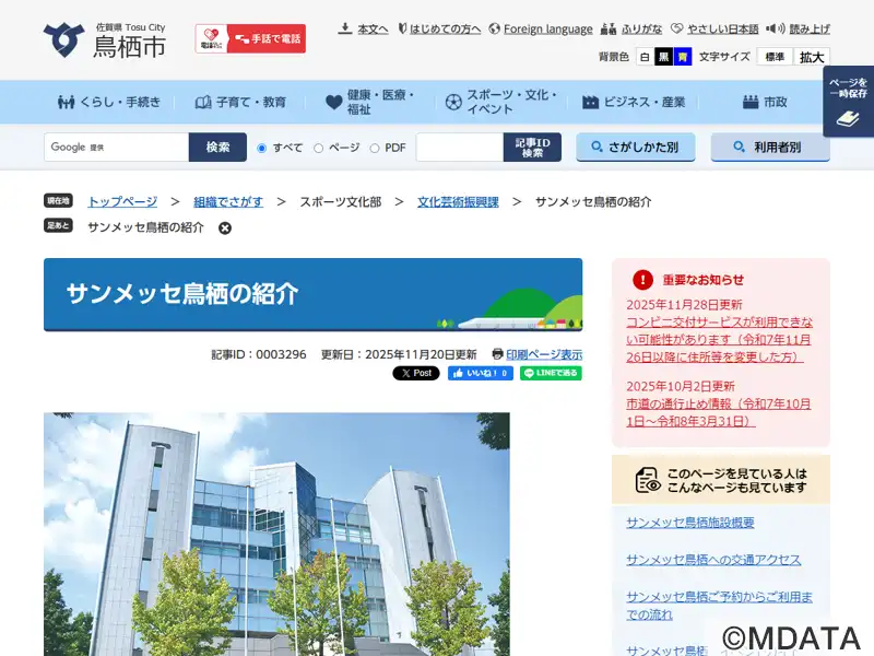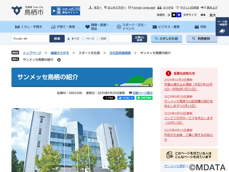 JR鳥栖駅の東隣、情報と遊びの機能を満載した出会いと創造の広場。1階ロビーには映画「月光の夏」で話題となったピアノ“フッペル”を展示。終戦記念日には平和コンサートが開催される。4・5階ホールは、ステージを中心とした鑑賞型イベントからアリーナを利用した会議・パーティまで、多彩なイベントに対応する多目的ホール。地上25mの展望台からは市街地を一望できる。
