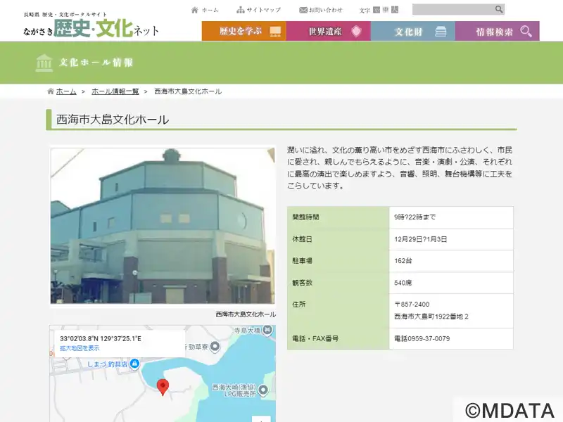 西彼杵半島の西にある大島町の、寺島大橋の近くの潮風が漂う海辺に建っているホール。地域の芸術や文化、人々の交流の中心的な場所であり、市民に広く愛されている公共施設。メインホールの残響時間は1.53秒で、客席数は540席。このホールでは、コンサートや演劇、講演、映画上映会などが開催され、音響、照明、舞台機構などにも工夫が凝らされ、最高の演出が楽しめる。市役所、図書館、大島町武道館、小学校が隣接する。