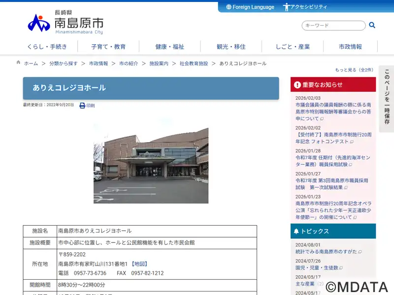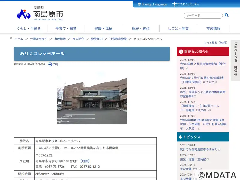 長崎県南島原市中心部に1996年に開館した、多彩な文化イベントに対応できるホールと公民館機能を併せ持つ市民会館。ホールの名称は歴史的・文化的な遺産であるキリシタン時代の「コレジヨ」から名付けられている。728席の多目的ホールは、コンサートや演劇など、新しい感動が生まれるエネルギーに満ちた空間で、広いステージと充実した設備を備え、南島原市の文化の拠点となっている。有家図書館、有家保健センターを併設。