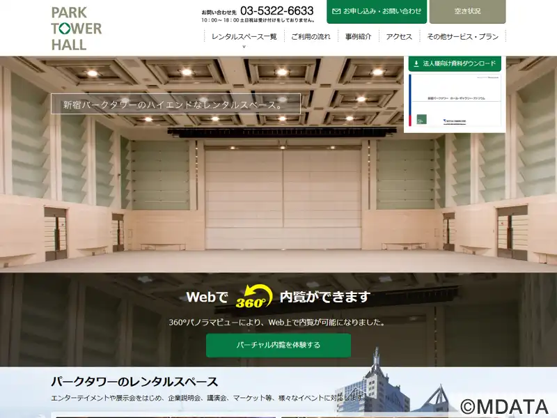 新宿の三角屋根が特徴の高層複合型ビル、新宿パークタワー3階にあるレンタルホール。約450㎡のホールと250㎡のホワイエ、3つの控室を備え、壁面に大理石やタピストリーガラスを配した清楚な白磁の器のような空間が特徴のスペース。大型展示物も搬入可能で、展示会、展覧会のための平土間形式、コンサートや講演会のための客席を設置したシアター形式、セミナーやシンポジウムに最適なスクール形式など自由なスタイルで利用できる。
