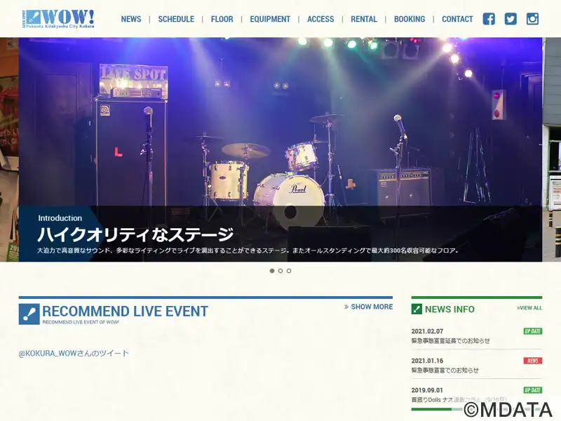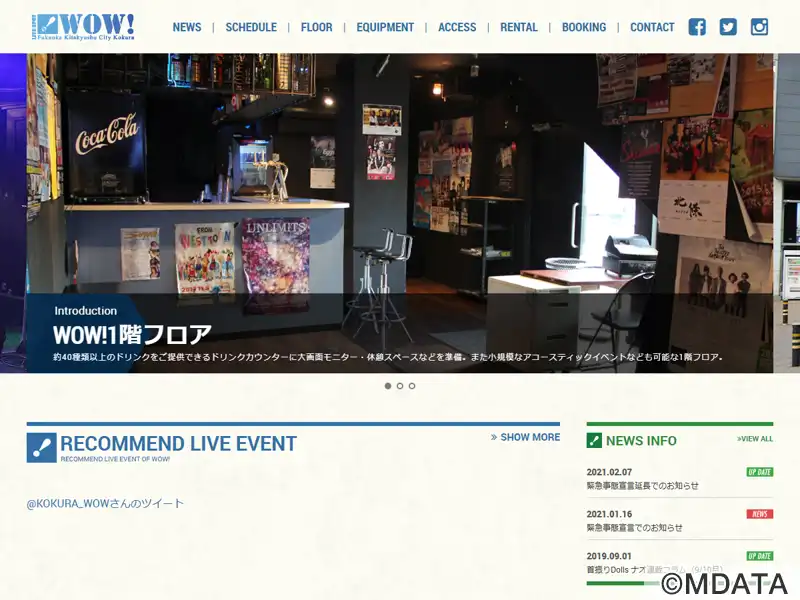 西小倉駅南口ダッシュ20秒。1990年にオープン以来、たくさんの WOW! を発信してきたライブハウス「小倉WOW!(ワウ)」。2012年4月改装リニューアルし、1Fがチケット受付とBARカウンター&大型モニター・休憩スペース、2Fライブホール(スタンディング300名、BARカウンターの分だけ拡張)。北九州一の音響・照明設備でメジャーアーティストからインディーズ、クラブ・ダンスイベント幅広く対応。
