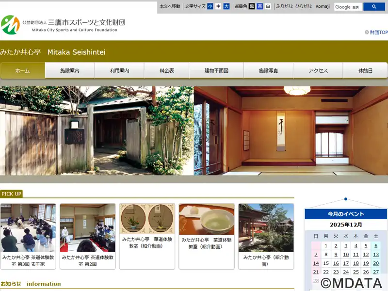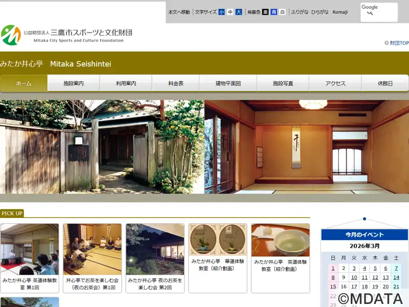 1988年に三鷹市が古典文化の振興や交流を目的に建設した和風文化施設。数寄屋造りの建物は、純日本の風格を漂わせ、本格的な茶室や泉水を配した日本庭園も併設されている。太宰治邸のサルスベリの木も移植され、太宰治賞の選考会場にもなっている。座布団百枚のお座敷で聴くことができる落語会「寄席井心亭」が開催され、マイクを通さずに生の声で落語を楽しめる。さらに、茶道体験教室や華道体験教室なども定期開催している。