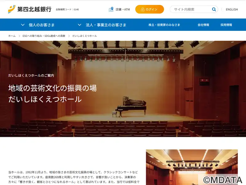 旧第四銀行本店内に「だいしホール」として1992年11月開館。2021年1月に第四銀行と北越銀行が合併し「第四北越銀行」設立にともない、ホール名称変更。聴衆との一体感に優れた269席のホールは演奏家からも評価が高く、地域の文化芸術振興の場としてクラシックコンサート等に活用されている。新潟県ゆかりの音楽家の活動支援としてホールを無料で提供する「第四北越銀行支援事業」を実施。ピアノはベーゼンドルファー275。