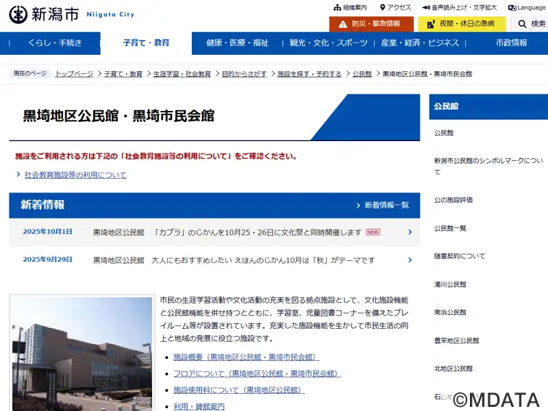 新潟市黒埼地区における文化活動と生涯学習の拠点として、2006年に開館した公民館を併設する複合文化施設。ホールは移動観覧席と舞台設備を備え、コンサートや講演会など多岐にわたるイベントに対応する。また、音楽室、美術工作室、調理実習室、多目的ルームや講座室のほか、事前予約なしで使える学習室、児童図書コーナーのあるプレイルームなども用意され、親子向けの活動や地域コミュニティの促進にも力を入れている。