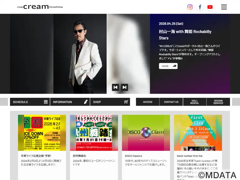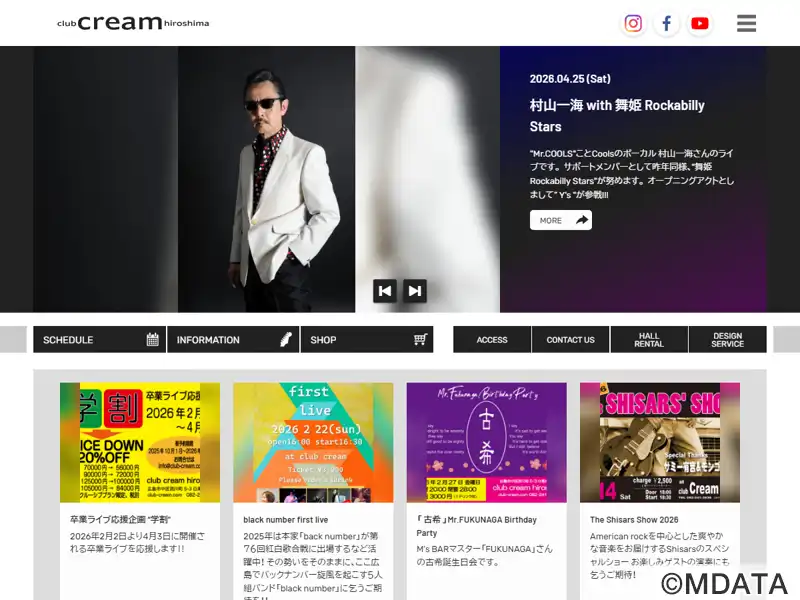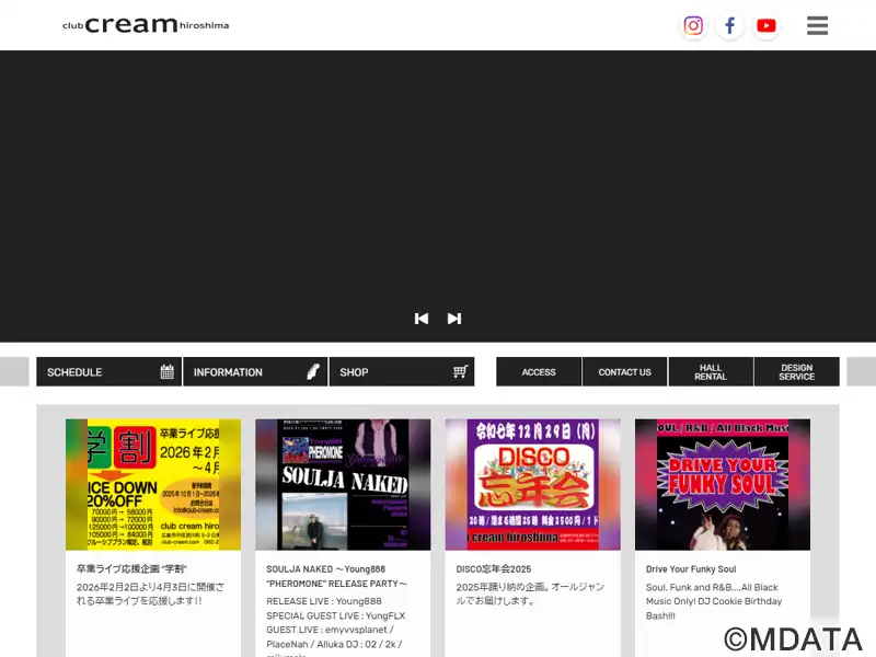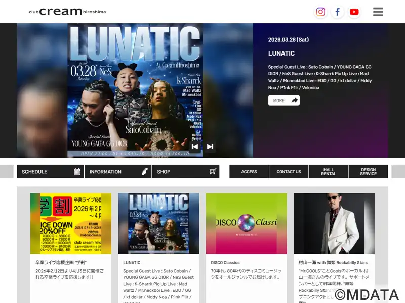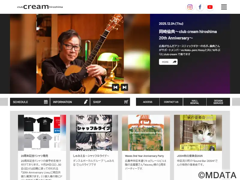 中国地方最大の歓楽街・薬研堀通りに、2005年にオープンしたライブ&イベントスペース。こだわり抜いた音響システムと快適さを追究した空間設計により、演奏するミュージシャンとオーディエンスがともに心地よく音楽を楽しむことができる。ライブ仕様とクラブ仕様の両方に対応でき、ジャズ、ロック、ブルースなどのライブや、ディスコ、歓送迎会や結婚式などの各種パーティやセレモニー、展示会などのイベントにも利用できる。
