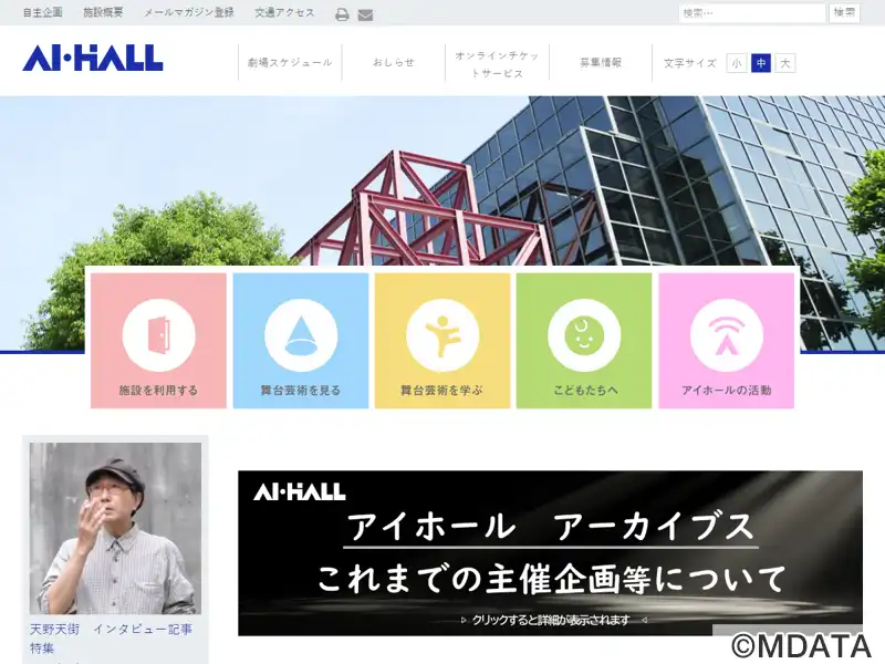 現代演劇とコンテンポラリーダンスを柱に、地域に根ざしたオリジナリティある自主事業を展開する関西屈指の劇場。イベントホール(通常300席)は35分割昇降床により多様な舞台・客席形式が可能。年間を通して質の高い自主企画・共催公演を上演し、戯曲賞受賞者を輩出する「伊丹想流劇塾」などの実践講座やワークショップを開催。「break a leg」「アイフェス!!」など次世代応援企画にも注力。1988年開館。