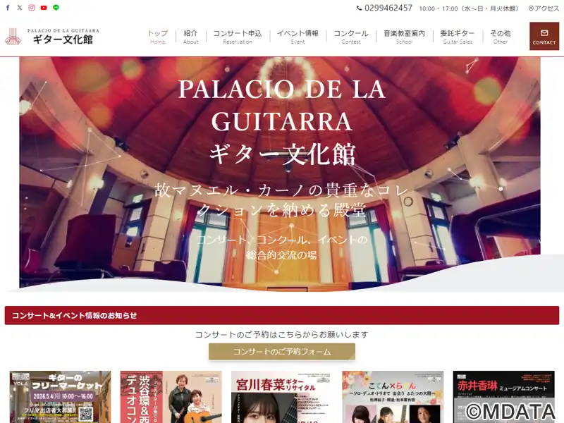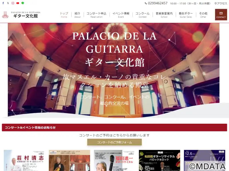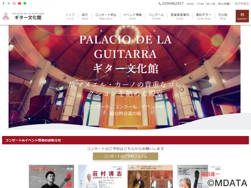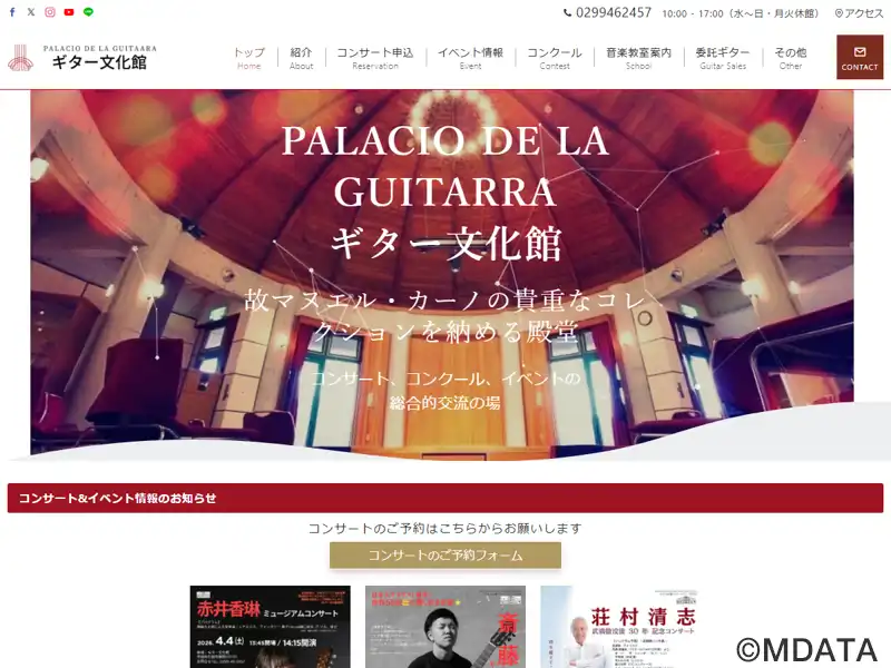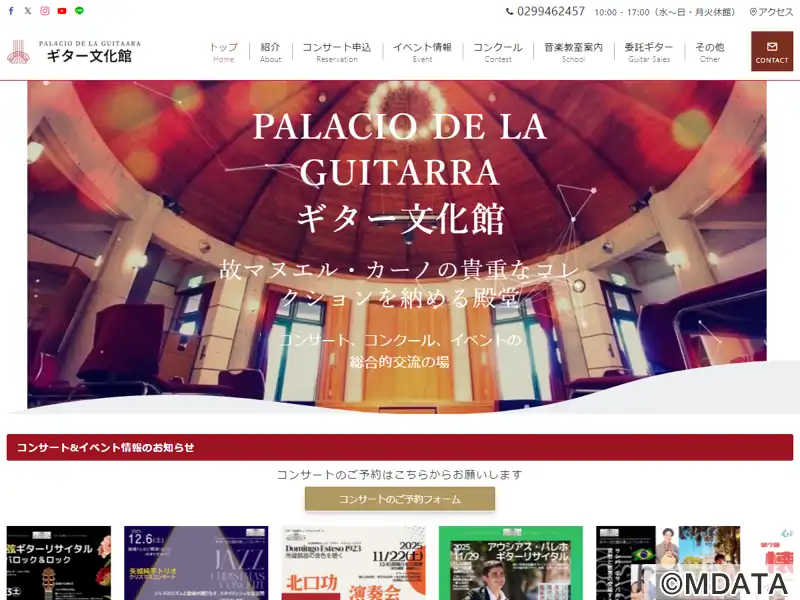 茨城県石岡市に1992年に開館したギターの殿堂。フラメンコギターの巨匠マヌエル・カーノ氏(1925-1990)の寄贈コレクションをはじめ、世界各国のギターを展示・所蔵し、音楽教室やアンサンブル練習会など、ギターを通じた交流の場として活用されている。メインのホールは、ギターと同じ木材を使用した響きの良いドーム型天井が特徴で、フリーコンサートや一流ギタリストのリサイタル、コンクールが開催されている。