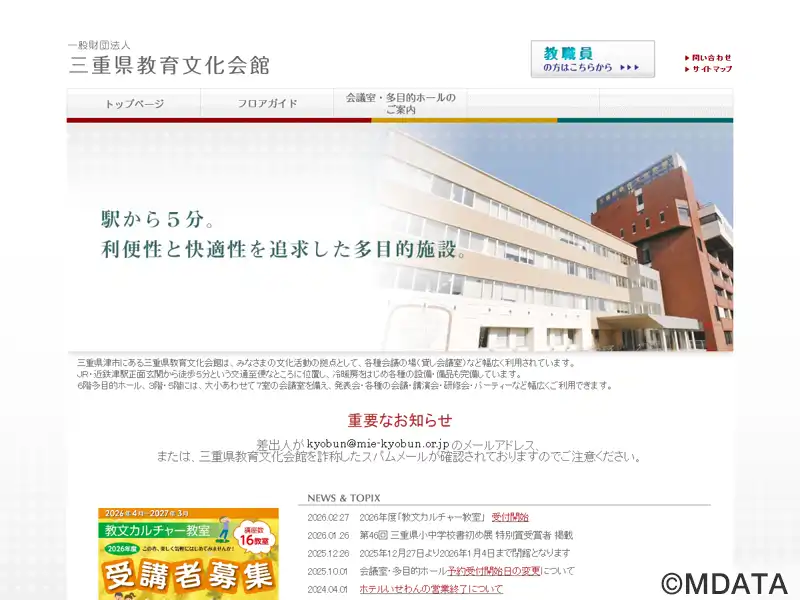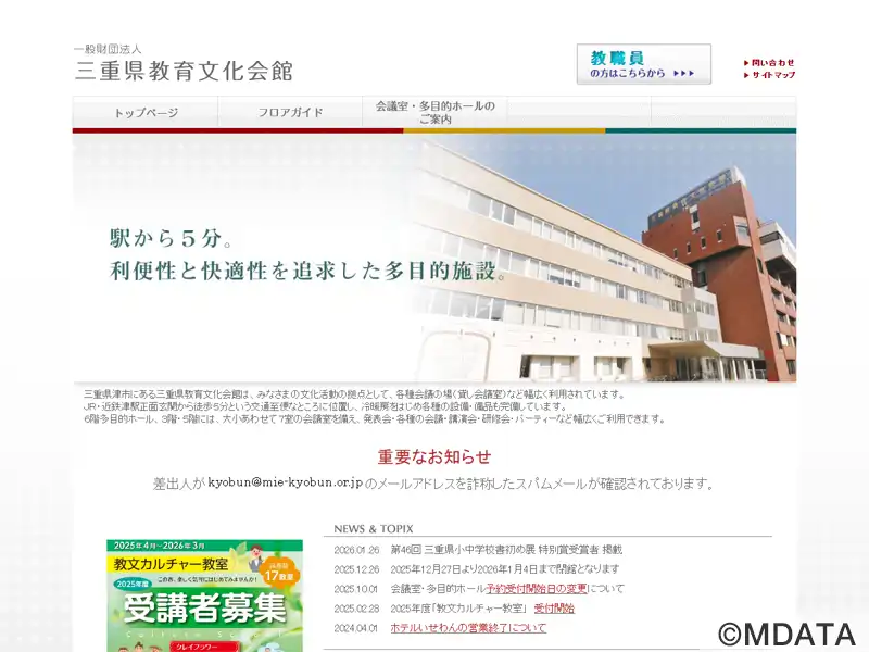 三重県津市の近鉄津駅徒歩5分にある、ホールや7つの会議室、レストラン、ホテルが併設された多目的施設。県民の教育・文化の向上と福祉の増進、県内教職員の厚生福祉に寄与することを目的に設立された。6階にある多目的ホール(227㎡)にはスタインウェイのグランドピアノ、壁面収納式ステージ(縦2,43m、横6m)、スクリーンや壁鏡を完備し、歌や演奏、ダンスなどの発表会、上映会や講演会など幅広く利用されている。