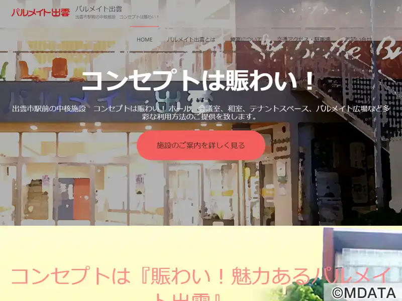 出雲市の出雲市駅北口に、市民交流の場として2003年4月に開館した文化施設。本館4階の「パルメイトホール」は、ピアノや音響機器も完備したフラットホールで、コンサートやライブ、発表会、ダンス、展示会、パーティーなど用途に応じたレイアウトで多目的に利用できる。また、会議室や和室、野外イベントやイルミネーションでもおなじみの「パルメイト広場」も併設。市民だけでなく、観光客やビジネス客にも利用されている。