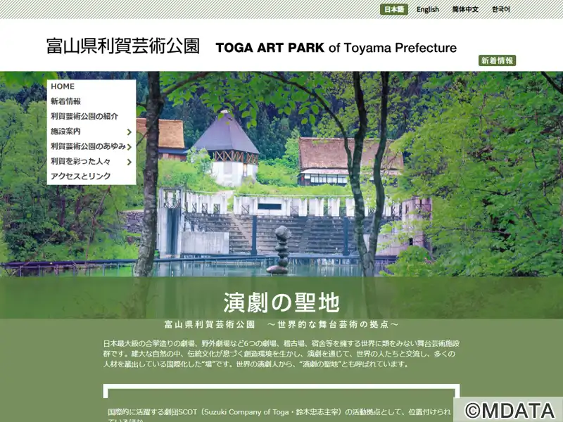 富山県南砺市利賀地域に位置する大自然に囲まれた舞台芸術の拠点。1973年に伝統的な合掌造り家屋の保存を目的として整備が始まり、1976年には演出家・鈴木忠志と劇団SCOTが本拠地を移したことから、演劇活動の中心地として発展した。合掌造りを改装した「利賀山房」や磯崎新設計の「新利賀山房」、ギリシャ風の野外劇場、利賀スタジオ、創造交流館など様々な施設が点在し、日本最大級の舞台芸術施設群を形成している。