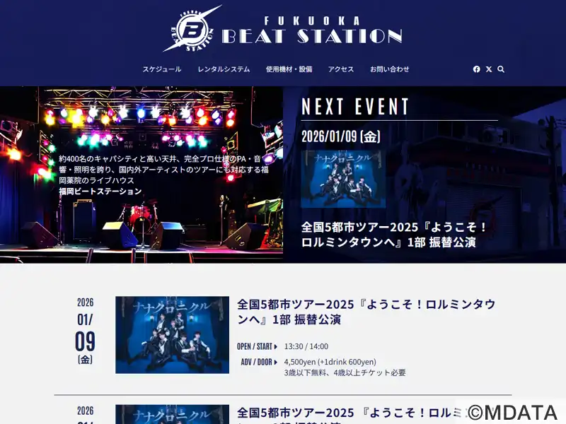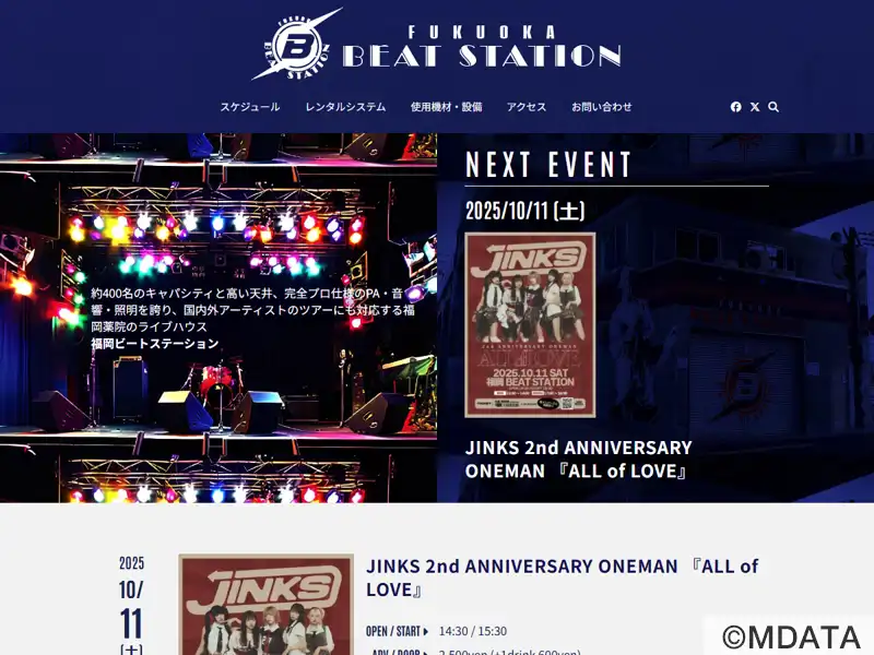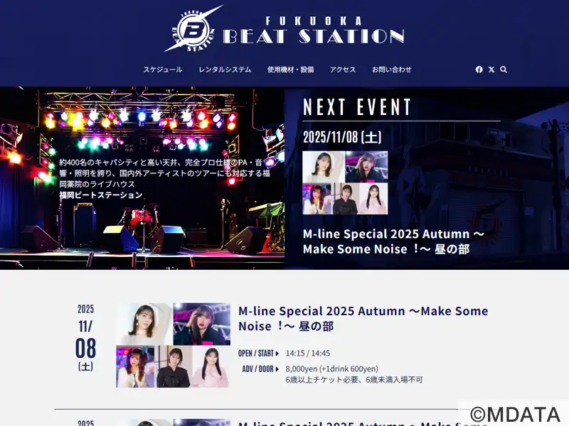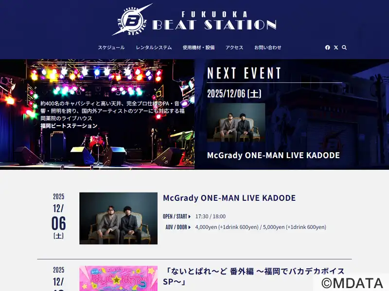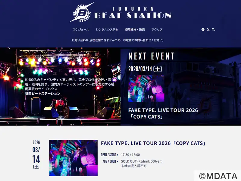 西鉄薬院の高架下でさまざまな人と音楽が行き交うライブハウス「福岡BEAT STATION」。1号店の天神ハートビート(1987-2017)につぐ2号店として2005年7月オープン。薬院駅北口から線路沿い徒歩1分。開放感のある吹抜けのホール、約1.1m高さのステージにプロ仕様の音響・照明設備をそなえ、国内外アーティストのツアー公演など多様なイベントを開催。1Fロビー、デッキホールにバーカウンター。