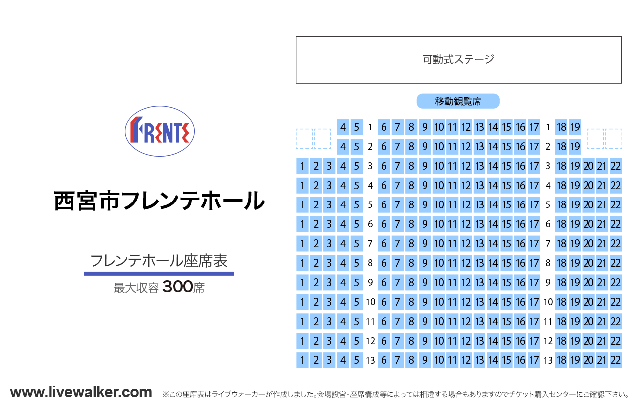 兵庫県の西宮駅南口にある複合商業施設フレンテ西宮の5階に1994年に開館した公立文化施設。昇降式ステージを備えた300席のホール、練習室、多目的スペースがあり、地域の芸術文化活動を支える重要な施設として機能している。ホールは可動客席を収納するとオープンフロアとして利用でき、音楽、演劇、ダンス、映画会、講演会、パーティーなど幅広い用途に対応する。スタインウェイのセミコンサートピアノを完備している。