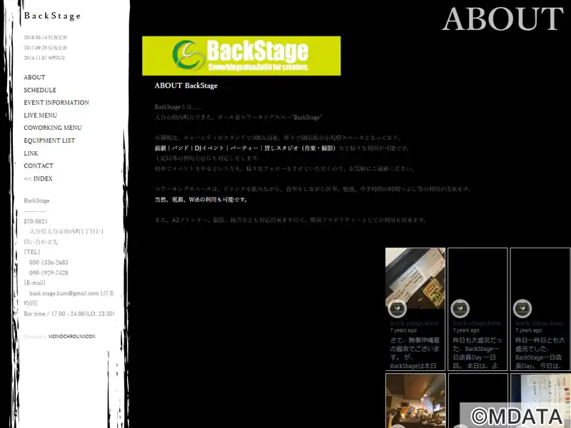 大分初の小劇場(ホール)&コワーキングスペースとして2014年9月オープンした「バックステージ」。大分の舞台創作ユニットBackStage國吉氏が代表。ホールは最大キャパ100人。芝居、ライブ(バンド~弾き語り)、DJイベント、上映会、撮影など様々なシーンに対応するクリエイティブ・スペース。貸しスタジオとしても利用OK。カフェメニューも充実。サンリオビル右折、太田旗店斜向かいのビル3F。