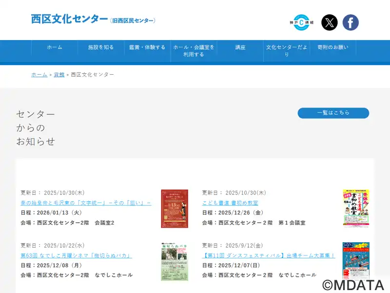神戸市西区の西神中央駅近くに位置する1989年開館の文化施設。最大480席を備えるプロセニアム型の大ホール「なでしこホール」では、コンサートや映画上映、演劇、発表会など多彩なイベントが開催され、可動席の調整によりダンス会場としての利用も可能。また、壁面鏡とピアノが常設された多目的ホール、会議室や視聴覚室、料理室、和室、音楽室、美術室、陶工芸室など諸室が用意され、多様な講座や文化活動が行われている。