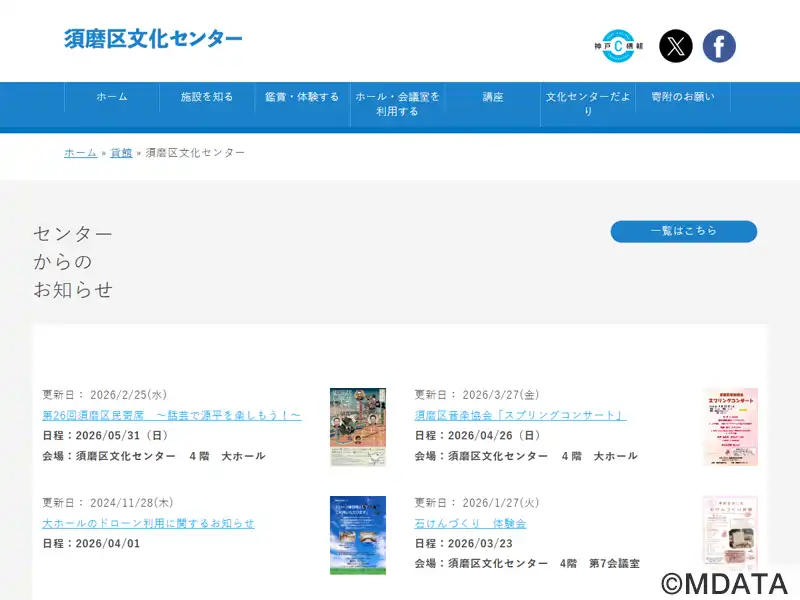 神戸市須磨区における文化活動や地域交流の拠点として1981年に開館した文化施設。大ホールには舞台、音響・照明設備が用意され、講演会やコンサート、映画上映などに対応する。可動椅子によるフラットな設営も可能で、オーケストラの練習会場として須磨フィルハーモニー管弦楽団の練習拠点にもなっている。そのほか、音楽室、美術室、陶工芸室、料理教室、和室、会議室などの貸室があり、さまざまな講座を開催している。