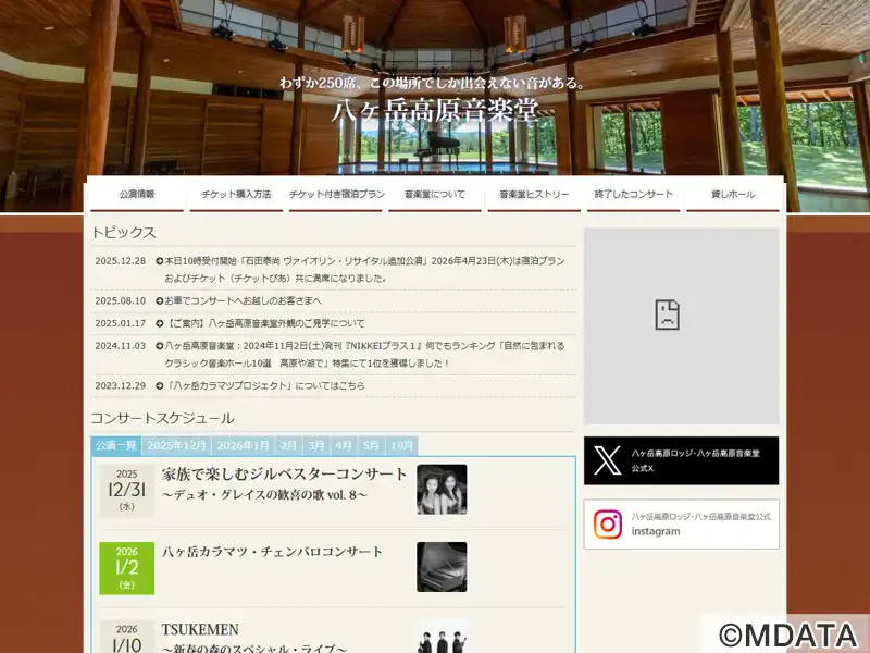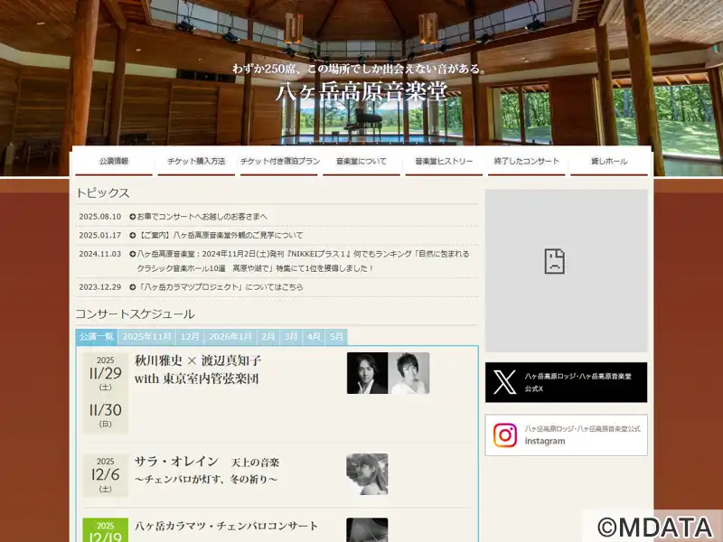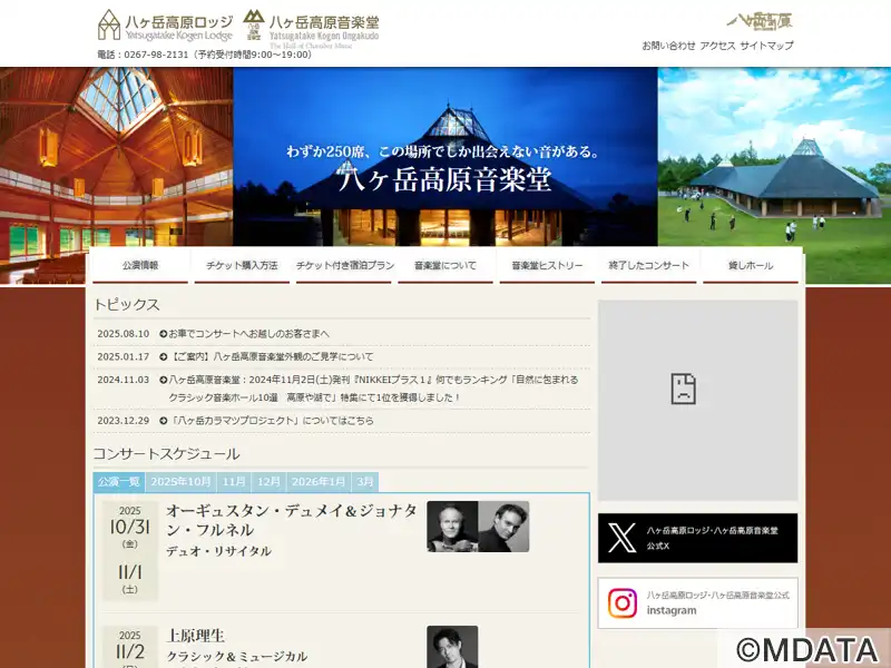 長野県南牧村の八ヶ岳の大自然に囲まれた音楽施設。1988年にスヴャトスラフ・リヒテルと武満徹をアドバイザーに迎えて設立された。建築家・吉村順三が設計した美しい六角形の木造ホールは、地元の樹木を使用し、温かみのある自然な響きを提供する。ホールは室内楽に最適な残響時間1.6秒を確保。ホワイエ、楽屋、録音室などの設備も充実している。毎年開催される八ヶ岳高原音楽祭には、世界的なアーティストが多数出演する。