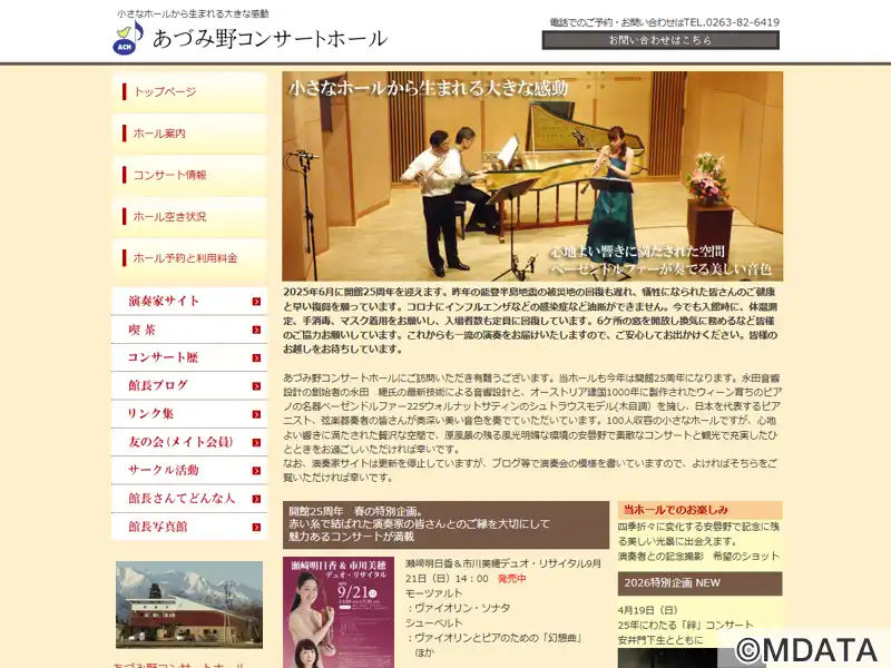 2000年にオープンした安曇野にある小さな音楽ホール。ピアノはベーゼンドルファー225ウォルナットサティンのシュトラウスモデル。全席S席の、心地よい響きに満たされた贅沢な空間で、日本を代表するピアニストや弦楽器奏者の演奏が奏でられる。ホールは100人収容で、室内オーケストラにも対応。また、レコーディングやピアノの時間貸しも可能。併設する喫茶テラスは、湧水のせせらぎが聴こえるリラックス空間となっている。