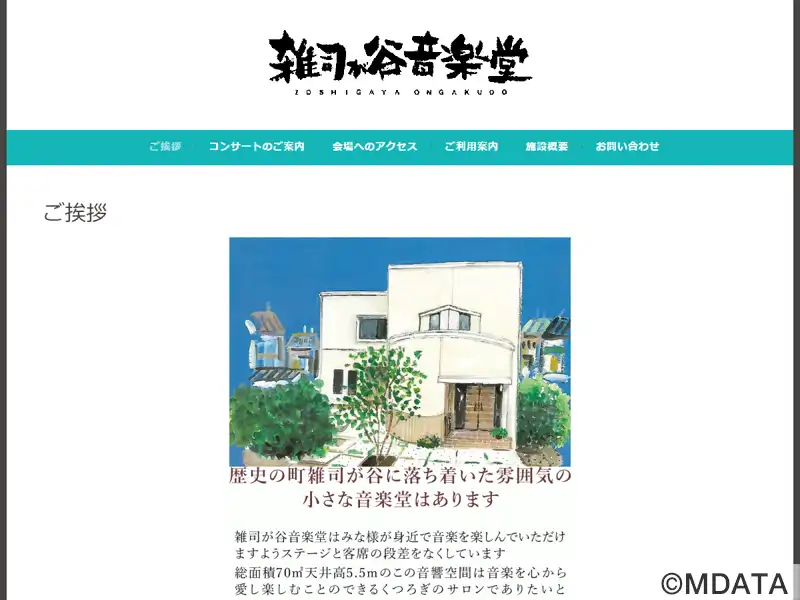 東京・豊島区の雑司が谷の住宅街に2001年オープンした音楽堂。天井高5.5mの吹き抜けと2階バルコニーを備えた、約60席のクラシックサロンで、70㎡のフラットなホールは段差がなく、演奏者と観客の距離が近い親密なコンサート空間を演出する。スタンウェイB型のピアノを常設し、チェンバロのレンタルも可能。サロンコンサートをはじめ、リサイタルや公開レッスン、音楽パーティーなど、様々な用途にスペースを提供する。