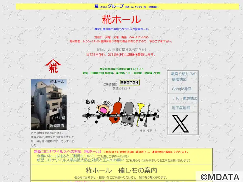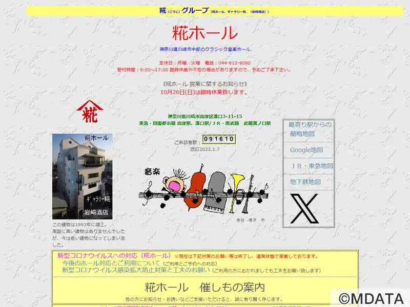 大山街道沿い「岩崎酒店」5Fに1993年11月オープンしたクラシックを主体とする音楽ホール「糀(こうじ)ホール」。木を敷き詰めたホワイエの奥はアットホームな約150席の音楽空間。天井高6m、舞台幅7.6m、奥行3.9m、高さ40cm。ピアノはスタインウェイB ・ヤマハC5。田園コンサート(主催:田園クラシック音楽の会)ではソロ・連弾・室内楽などリサイタル開催をサポート。