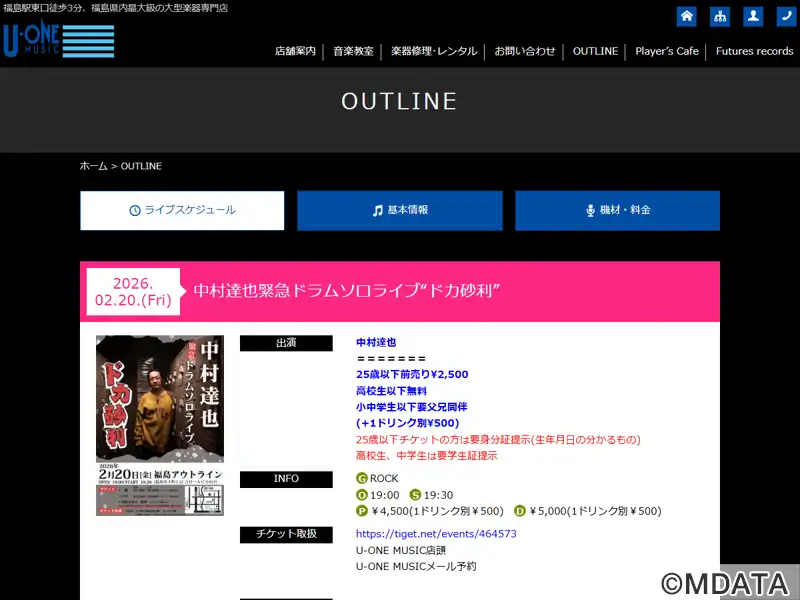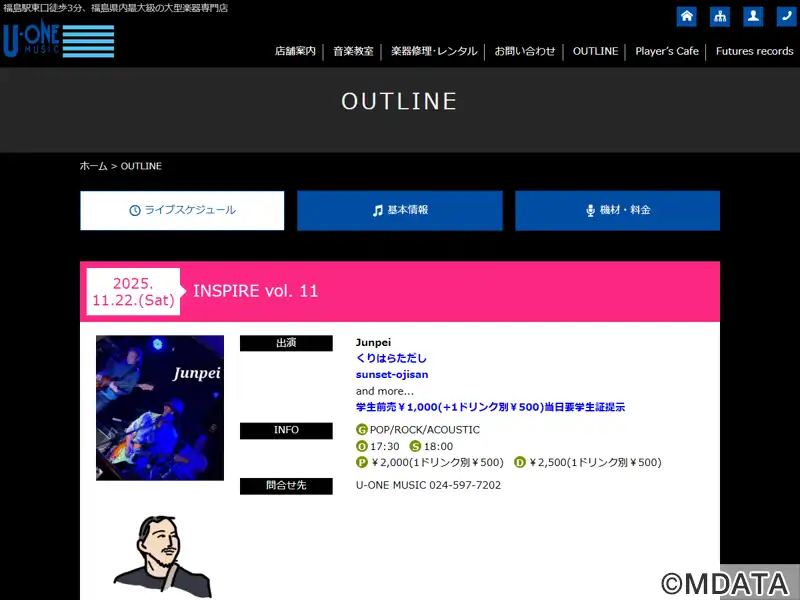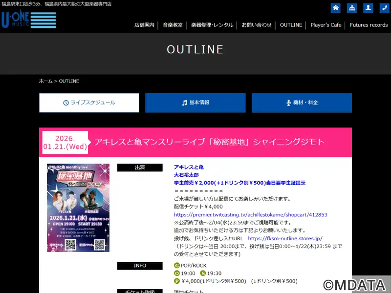 福島市大町にある、総合楽器店「U-ONE MUSIC」が運営するライブハウス。「福島のシーンは、福島の人が作る」をテーマに、地元のバンドが自分たちのスタイルで音楽を表現できるスペース。ブッキングライブや持ち込み企画、店外・県外からの主催イベント、平日はリハーサルスタジオとしてバンド練習にも利用できる。福島発の音楽と才能を、全国に向けて発信。多角的なアプローチで若手ミュージシャンの活動を支援する。