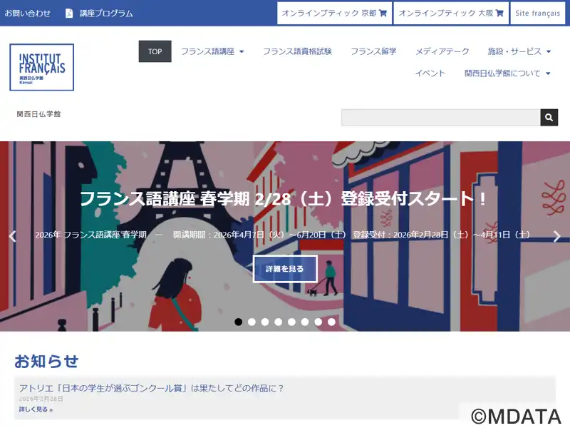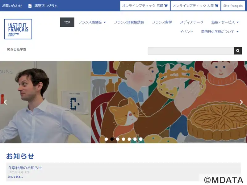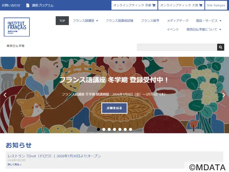 京都にあるフランス政府公式の文化センターで、日仏両国の文化的・知的交流を目的に設立。美しい洋館は、レイモンド・メストラレと木子七朗の設計で、国指定の登録有形文化財。「稲畑ホール」にはグランドピアノが常設され、コンサートやフランス映画の上映、講演会に利用されている。また、1990年から運営する京都フランス音楽アカデミーでは、毎年フランスからトップクラスの教授陣を招聘し、公開レッスン等を開催している。