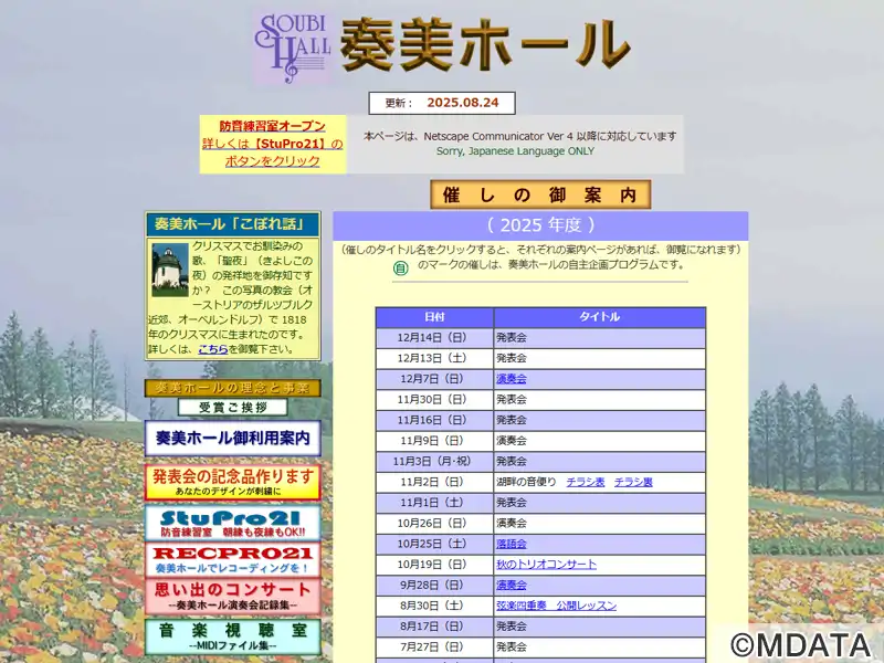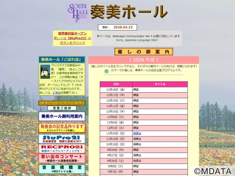 滋賀県大津市、琵琶湖のほとりに1997年開館した音楽ホール。青い窓枠のガラス張りファサードが印象的で、白を基調としたホールは天井高約5m、客席は約60席。ヤマハS4のグランドピアノを備え、柔らかな響きの中で室内楽、ジャズ、ポピュラー音楽のコンサートや発表会、レコーディングに対応する。防音練習室も併設され、リハーサルにも利用されている。地域の文化活動の拠点として、美しい音色を追求する場となっている。