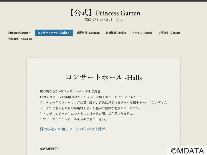 高輪プリンセスガルテン1号館にある2つの音楽ホール。シャンデリア輝く19世紀ウィーン風の優雅な空間「アンビエンテ」は天井高6m、花梨無垢ヘリンボーン仕上げのフロア最大120席。樹齢150年の無垢材を用いたステージ(間口8m×奥行4m×高さ40cm)とピアノは1991年製ハンブルグスタインウェイB-211。クリスマスショップ跡地に1911年製ベーゼンドルファー200設置の「アンディムジーク」併設。