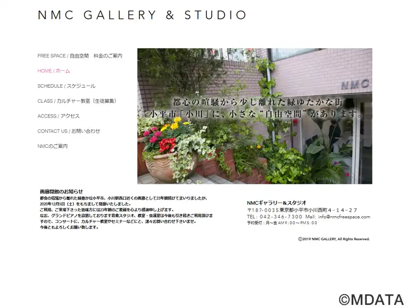 小平市小川の貸しスペース「NMC GALLERY&STUDIO」。半地下のギャラリー奥に、グランドピアノと音響設備を備えた「スタジオ」を完備。アンサンブル練習やレッスン、仲間とのミニコンサートやアコースティックライブなどに1時間1,500円〜利用可能。控室あり。ピアノ教室などカルチャー教室を開講中。ギャラリー(画廊)は2020年12月末で閉廊。音楽スタジオ・教室・会議室は引き続き営業。