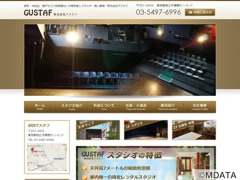 東京の狛江市に位置する劇団グスタフ専用の劇場で、貸し劇場、レンタルスタジオとしても利用できる。開放感のある7mの天井高の空間で、自由な創作が可能。ステージは平台を組んだ形態、またはフラットな状態のいずれの設営にも対応。2階部分も舞台装置として使用でき、立体感ある演出を生み出す。さらに、完全暗転、殺陣アクションの稽古、撮影にも対応している。小田急線の喜多見駅から徒歩、ま狛江駅からタクシーでアクセス。