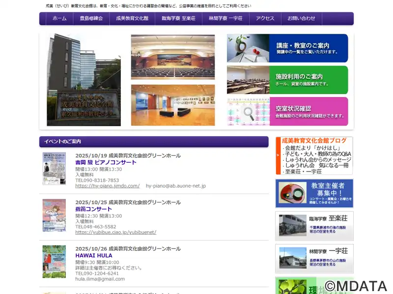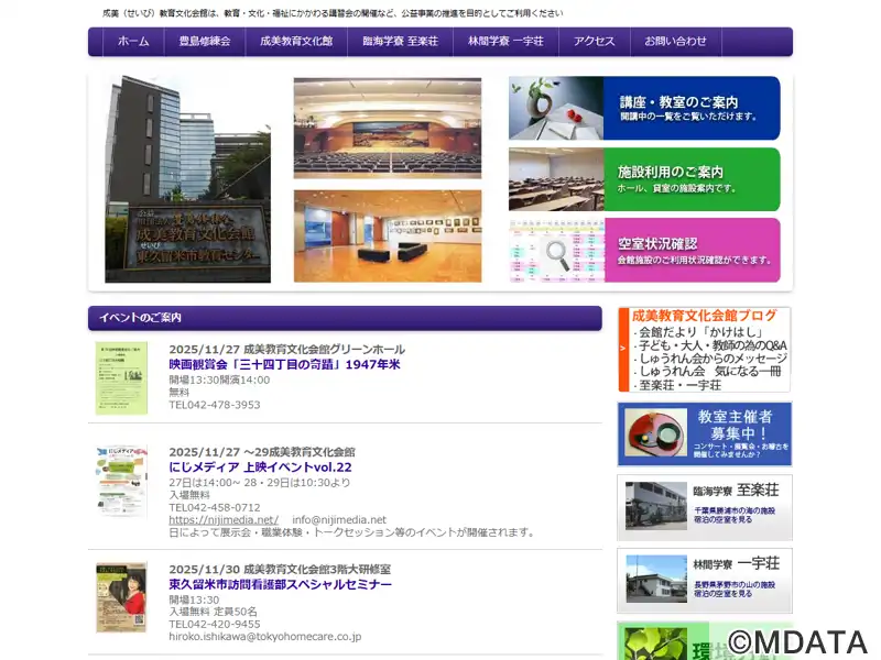 東久留米市に1997年に開館した多目的施設。文化会館や林間・臨海学校を経営する公益財団法人東京学習センターによる運営で、教育・文化・福祉の向上と地域社会の発展を目指している。成美グリーンホールには移動観覧席と舞台、グランドピアノがあり、コンサート、講演会、各種イベントに利用されている。その他、ギャラリー、音楽室、研修室、和室、茶室、会議室などが用意され、さまざまな教室や文化活動に活用されている。